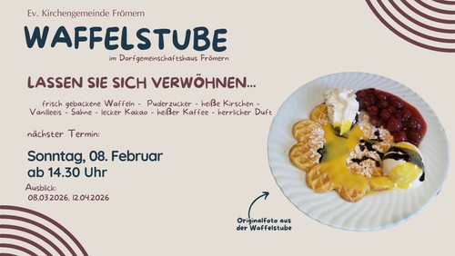Schaut vorbei und freut euch auf leckerste Waffeln und eine gemütliche Atmosphäre bei uns im Gemeindesaal! Die aktuellen Termine: 09.11.2025, 11.01.2026, 08.02.2026 und der 08.03.2026 - jeweils ab 14:30 Uhr im Gemeindehaus an der Brauerstraße 5, 58730 Fröndenberg/Frömern.