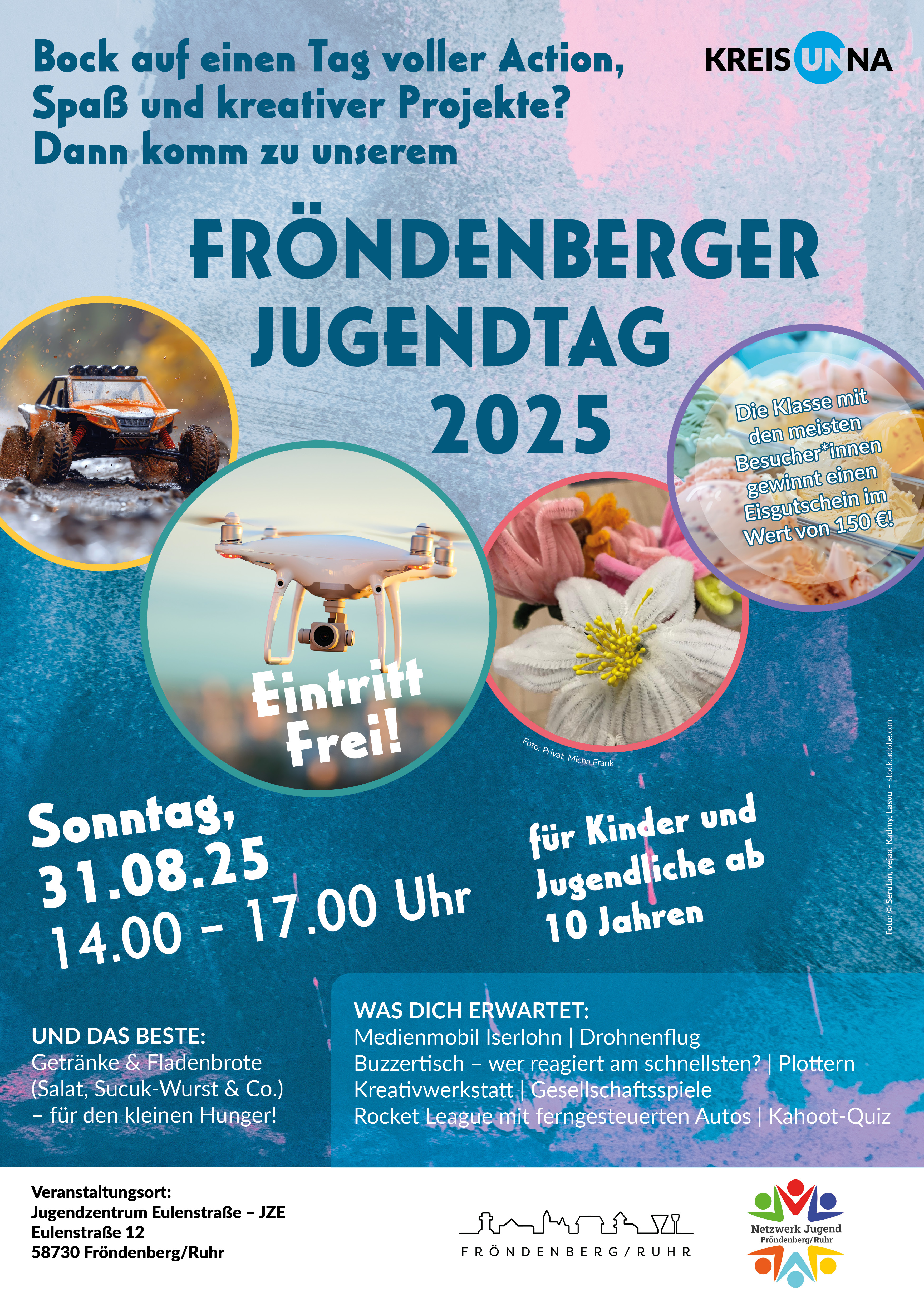 Am 31.08.2025 findet von 14-17 Uhr der Fröndenberger Jugendtag 2025 im Jugendzentrum Eulenstraße (Eulenstraße 12, 58730 Fröndenberg) statt.