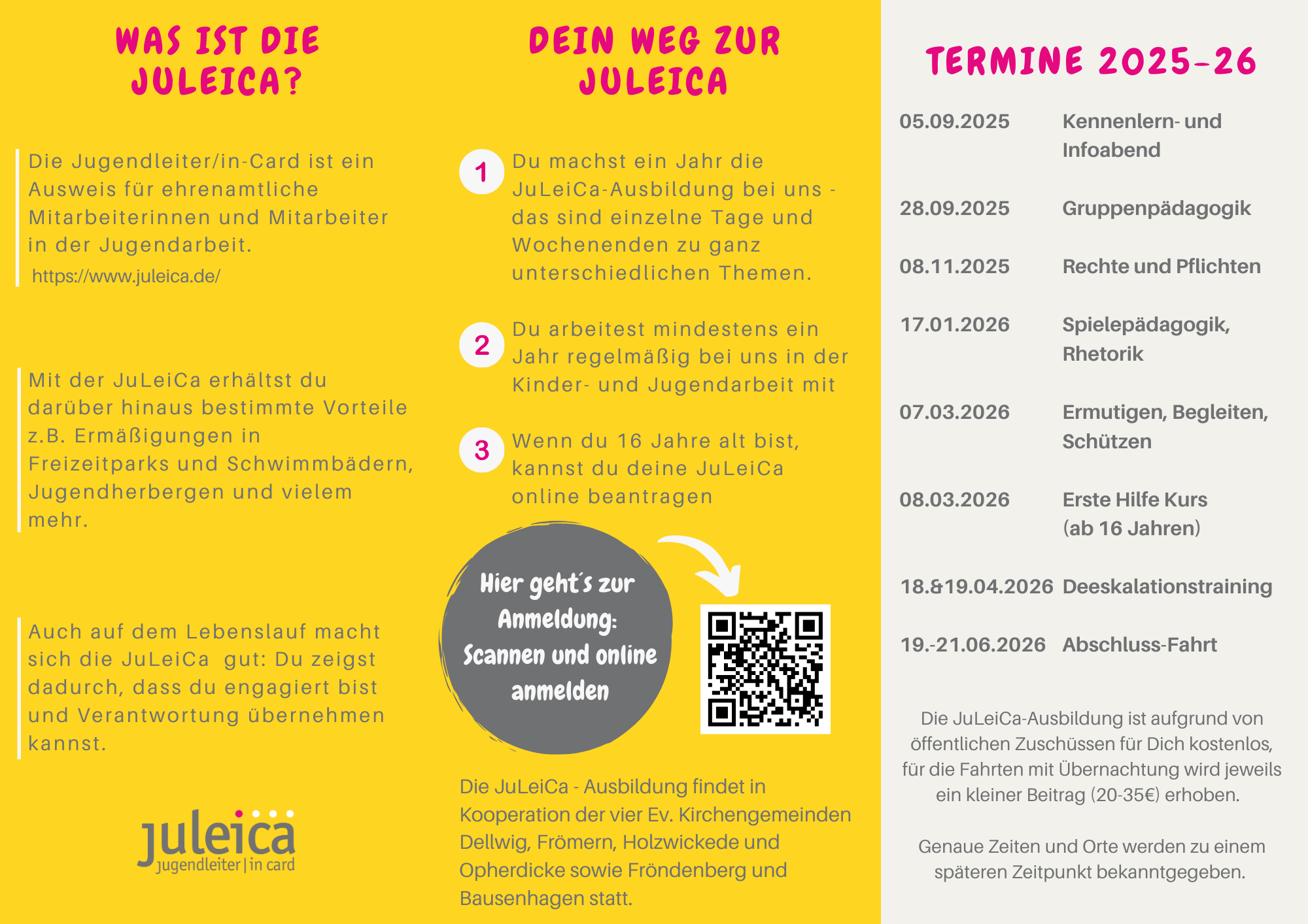 Ab September 2025 startet unser neuer Ausbildungskurs in Kooperation mit der Ev. Jugend Dellwig, der Ev. Jugend Fröndenberg/Bausenhagen und der Ev. Jugend Holzwickede/Opherdicke. Nähere Informationen sowie die Daten zu den einzelnen Kursen sind im angehängten Flyer zu finden.